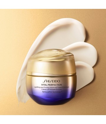 Shiseido Vital Perfection Uplifting and Firming Advanced Cream Enriched es una crema 24 horas de textura rica y suntuosa que combate la flacidez, la falta de elasticidad, las arrugas profundas y manchas. Protege frente a la sequedad y revela una piel más tersa, firme y luminosa en tan sólo 1 semana.*