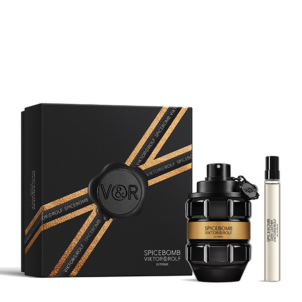 - Spicebomb Extreme Eau de Parfum 90 ml y tamaño viaje 10 ml: un perfume de hombre basado en el Spicebomb original. Las notas altas de pomelo chispeante están realzadas con notas de bayas junto con pimienta negra para hacer subir más la temperatura e intensidad. El corazón aromático está rodeado por el aroma de las especias cálidas: comino, canela y azafrán, dándole una personalidad masculina pero sensual. La nota del tabaco se refuerza con las notas balsámicas de vainilla que se contrastan sensualmente con el ámbar amaderado creando así una fragancia dentro de la familia ambarada oriental.